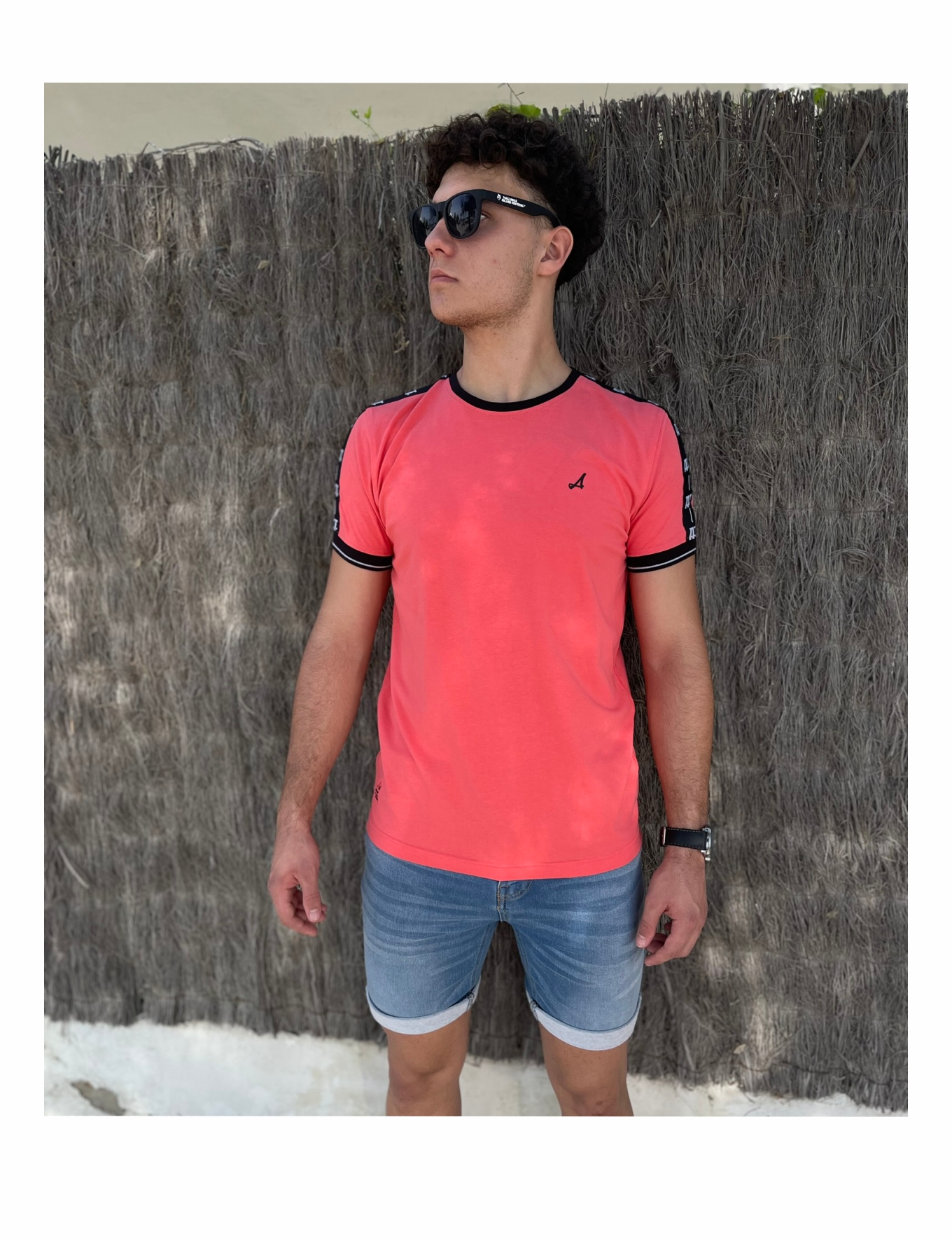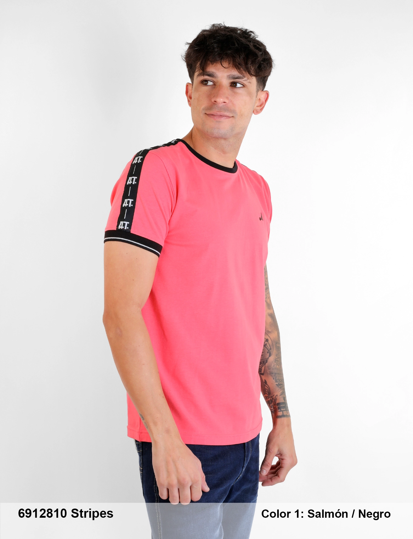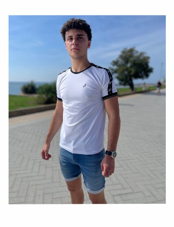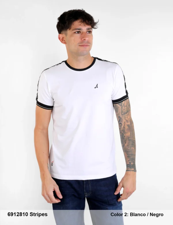 Descripción: Cuello redondo acanalado, manga corta, corte regular, cinta tejida en mangas, puño acanalado, logo engomada en pecho.