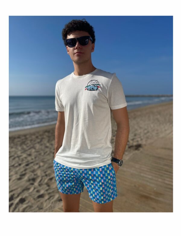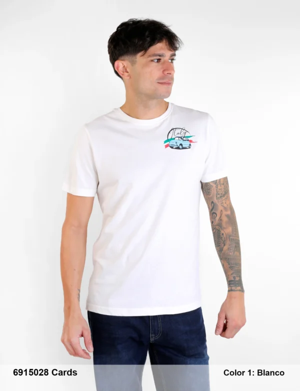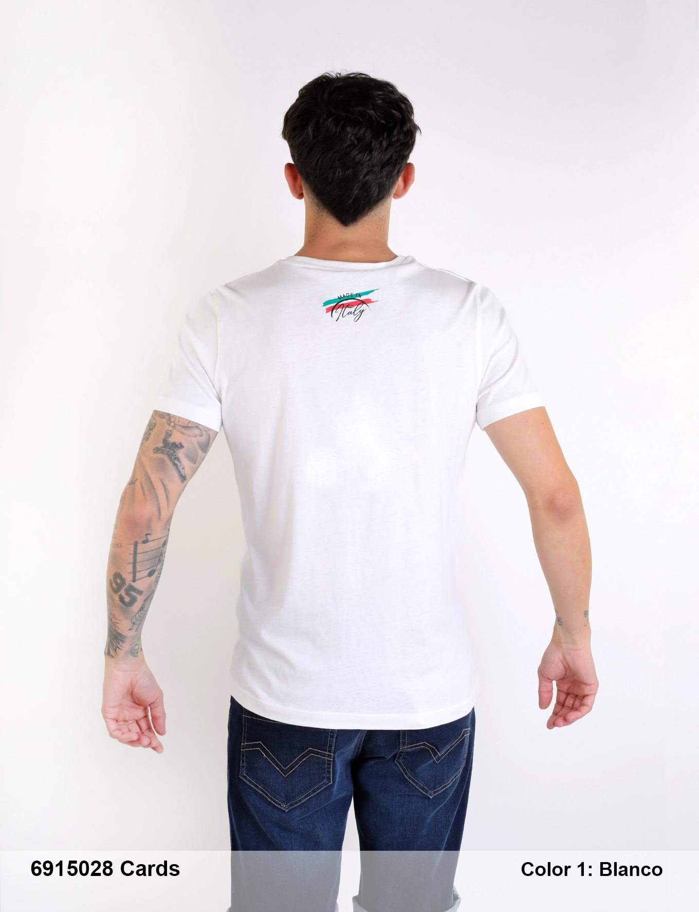 Descripción: Cuello redondo acanalado, manga corta, corte regular, serigrafía suave en parte delantera y trasera.