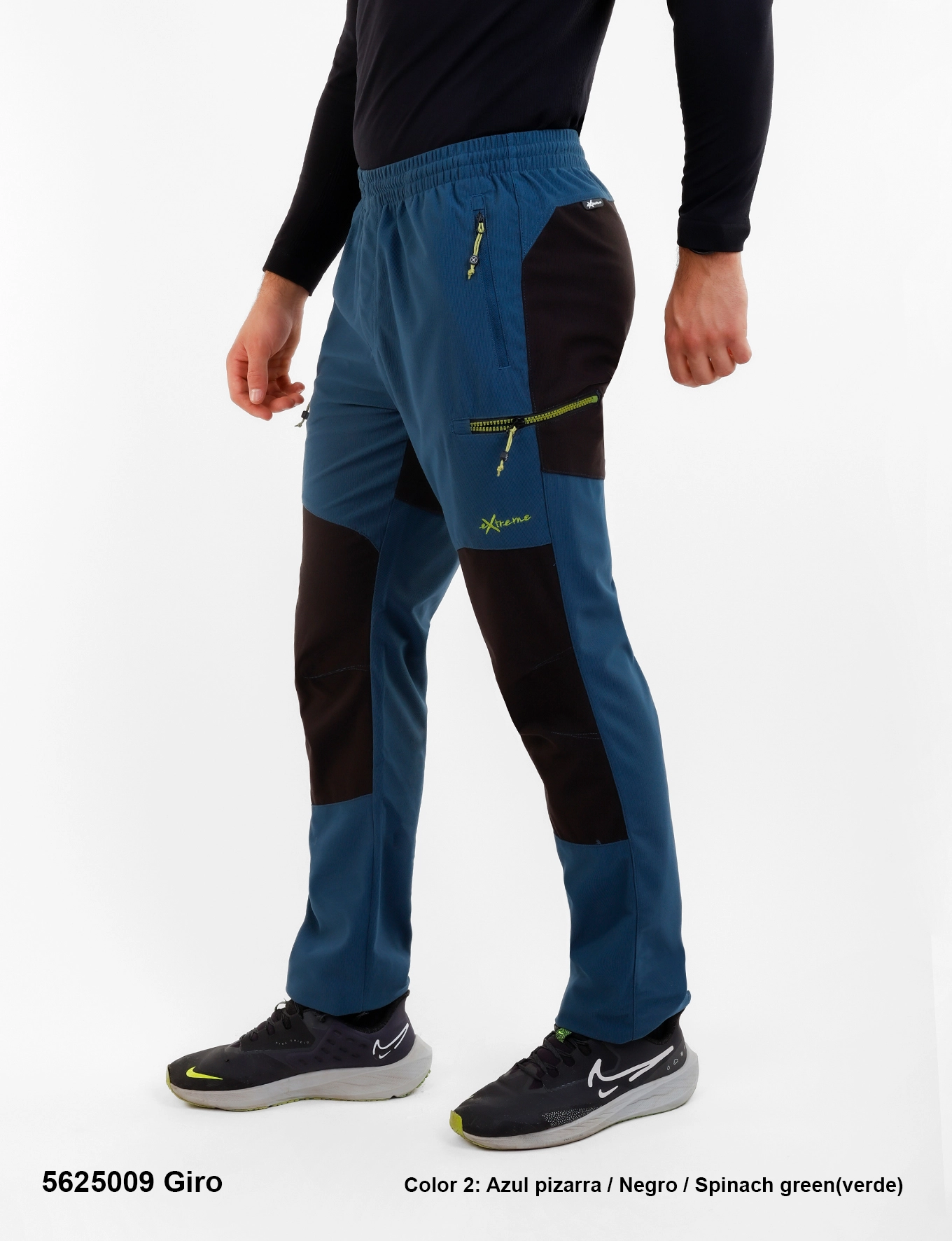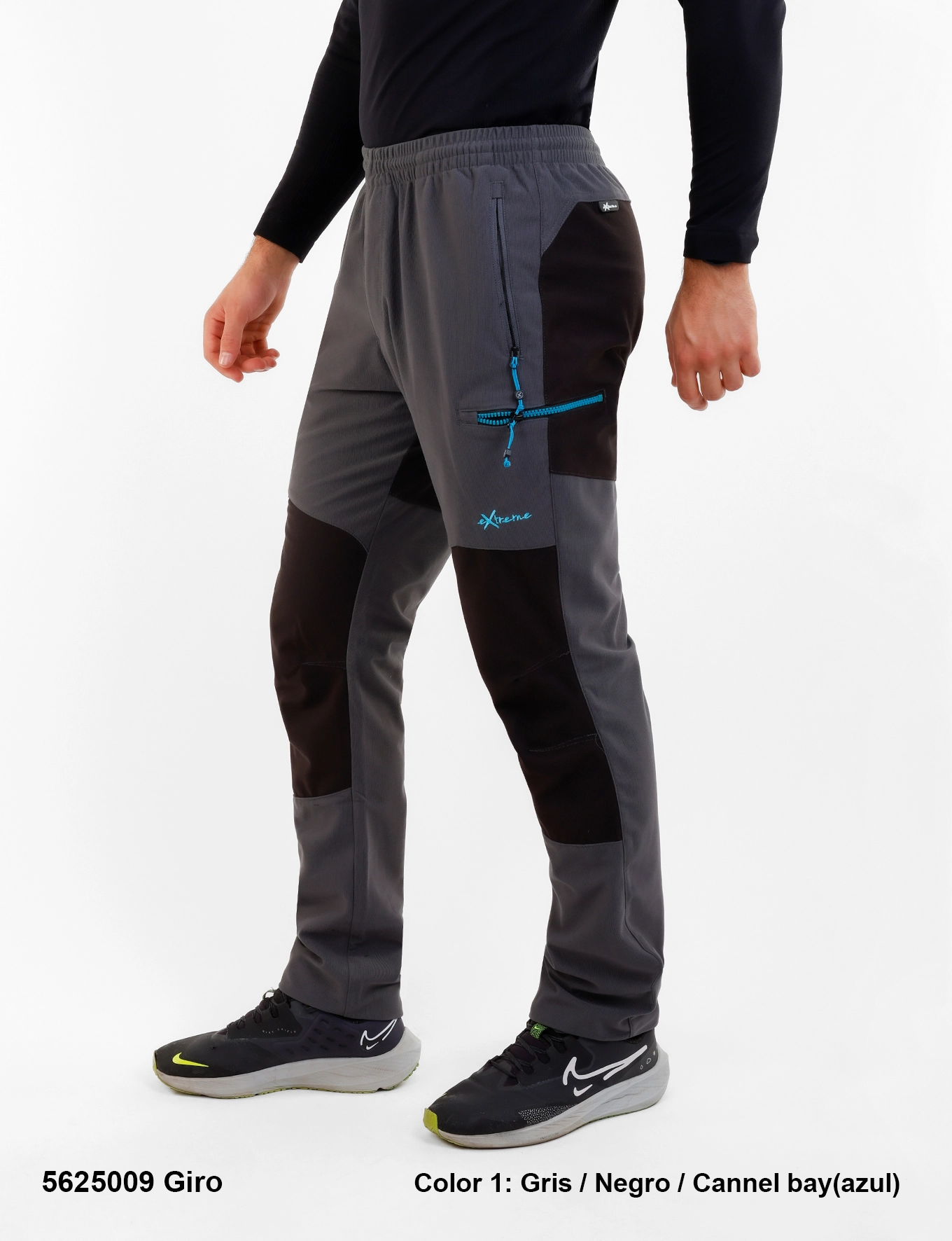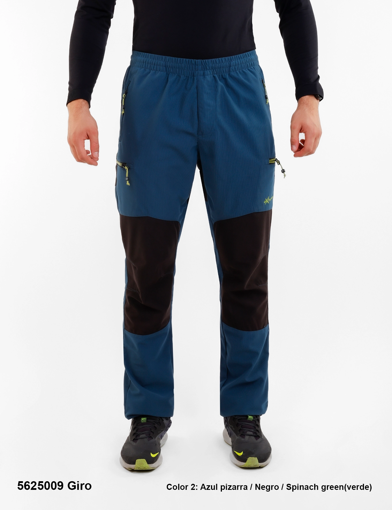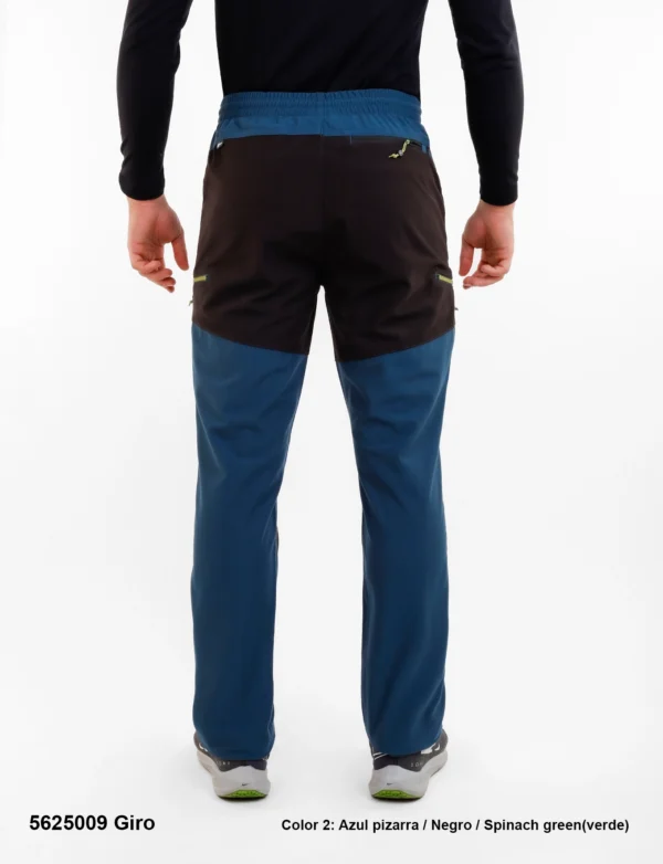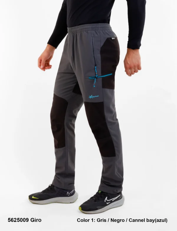 Descripción: Cintura elástica con cordón interno ajustable, bragueta con cremallera, cinco bolsillos: los delanteros y trasero con cremalleras invertidas, los laterales con cremalleras de plástico bicolor, logo bordado.